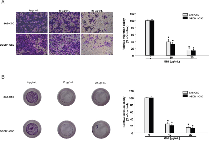 Given that CSCs exhibit highly tumor-initiating ability and are involved in metastasis and therapeutic refractoriness of cancer [6], we sought to examine the efficacy of GMI on self-renewal, colony forming, migration and invasion abilities of OCSCs. Secondary sphere formation and anchorage-independent growth assays were used to evaluate the self-renewal and colony formation capacities, respectively. A dose-dependent suppression of tumorigenic activities, including self-renewal (Figure 3A), colony formation (Figure 3B), migration (Figure 4A), invasion (Figure 4B) properties of OCSCs was observed. Collectively, these results clearly demonstrated that GMI exerted a pronounced anti-tumor effect on OCSCs.