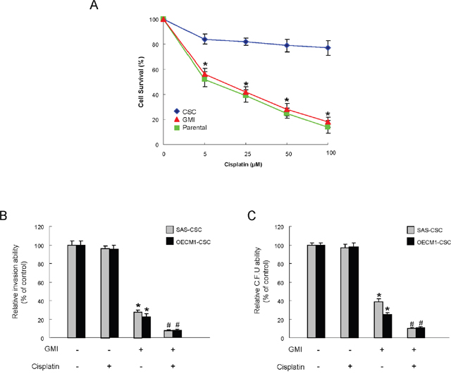 Figure 5: Enhanced sensitivity of OCSC by GMI treatment. (A) After exposure to different doses of cisplatin, the surviving cell fractions of the control or GMI-treated OCSC were evaluated. (B) Invasion ability and (C) colony-forming ability in OCSC were examined after treatment with either GMI or cisplatin treatment or both. *, p<0.05 GMI vs. control; #, p<0.05 GMI+cisplatin vs. GMI alone.