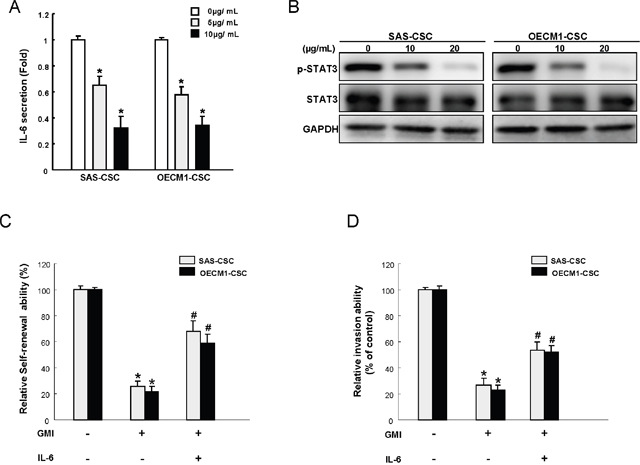 Figure 6: GMI treatment represses IL-6/STAT3 signaling of OCSC. (A) IL-6 secretion level in GMI-treated OCSC was analyzed by ELISA analysis. (B) Cell extract proteins of GMI-treated OCSC were collected and analyzed by immunoblotting against anti-p-STAT3, anti-STAT3, or anti-GAPDH antibodies as indicated. The immunoactive signal of GAPDH protein of different crude cell extracts was referred as loading control. Self-renewal (C) and invasion ability (D) in OCSC were analyzed after treatment with either GMI treatment or GMI combined IL-6 treatment. *, p<0.05 GMI vs control; #, p<0.05 GMI+IL-6 vs. GMI alone.