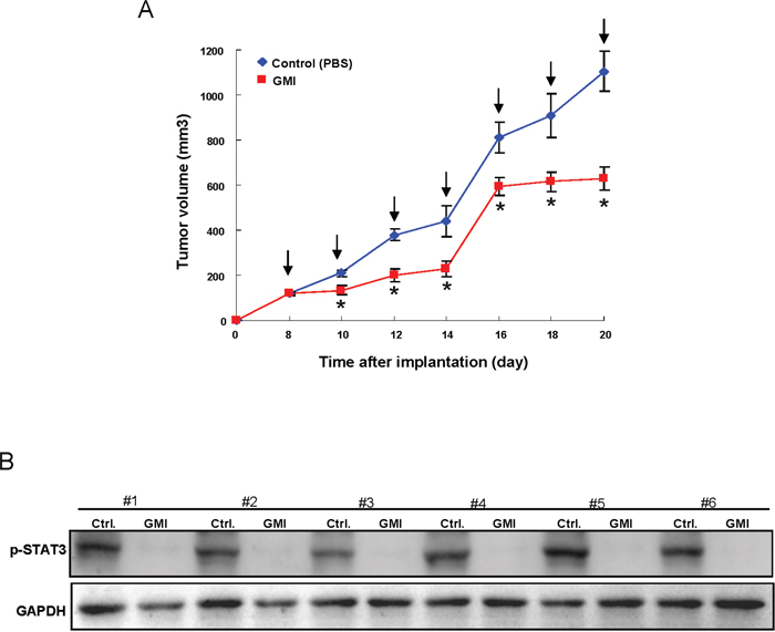 Figure 7: Therapeutic delivery of GMI in OCSC-transplanted mice attenuates tumor progression in vivo. (A) After subcutaneous implantation of OCSC, BALB/c nude mice (N = 6 for each group) were oral-feeding treated with GMI and then photographed and analyzed for the and tumor volume. (B) Mice were sacrificed, and tumor sections as indicated treatments were assessed for p-Stat3 expression by western bloting analysis. Values are expressed as mean ±SD. * p <.05 compared to control.