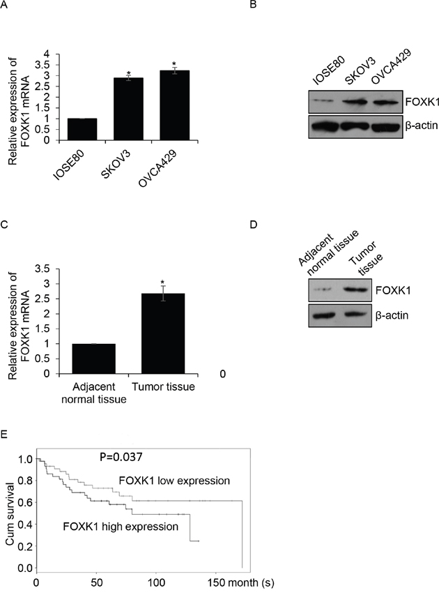Figure 1: FOXK1 is up-regulated in ovarian cancer and the expression of FOXK1 is corrected with poor prognosis of ovarian cancer (A). Total RNA was prepared from IOSE80, SKOV3 and OVCA429 cells, qRT-PCR was performed to detect the expression of FOXK1. (B). Whole protein was prepared from IOSE80, SKOV3 and OVCA429 cells, western blotting was performed to detect the expression of FOXK1. (C). Total RNA was prepared from 87 pairs’ tumor tissue samples and adjacent normal tissue samples, qRT-PCR was performed to detect the expression of FOXK1. (D). Western blotting was used to detect the expression of FOXK1 in tumor tissue samples and adjacent normal tissue samples. (E). The relationship between FOXK1 expression and survival curve was analyzed by Kaplan Meier method.