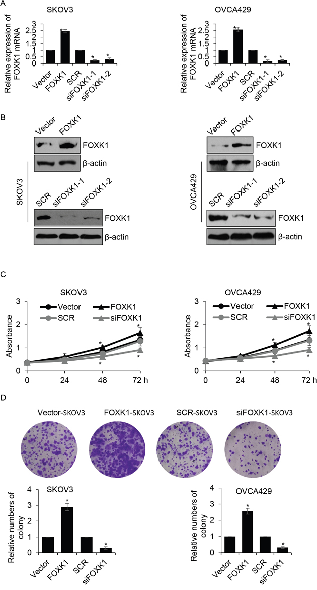 Figure 2: Overexpression of FOXK1 facilitates growth of ovarian caner cells. (A). SKOV3 and OVCA429 cells were transfected with empty plasmid (vector), FLAG-FOXK1, scramble siRNA (SCR), siFOXK1, respectively. The mRNA level of FOXK1 was determined by qRT-PCR. (B). FOXK1 was overexpressed or silenced in SKOV3 and OVCA429 cells, respectively. The protein level of FOXK1 was determined by western blotting. (C). FOXK1 was overexpressed or silenced in SKOV3 and OVCA429 cells, respectively. CCK-8 analysis was used to detect the effect of FOXK1 on cell proliferation. (D). FOXK1 was overexpressed or silenced in SKOV3 and OVCA429 cells, respectively. Colony formation analysis was used to detect the effect of FOXK1 on cell proliferation.