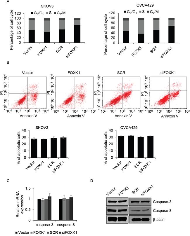 Figure 3: FOXK1 promotes G1/S transition, but has no effect on cell apoptosis. (A). SKOV3 and OVCA429 cells were transfected with empty plasmid (vector), FLAG-FOXK1, scramble siRNA (SCR), siFOXK1, respectively. Cell cycle was assessed by flow cytometer. (B). FOXK1 was overexpressed or silenced in SKOV3 and OVCA429 cells, respectively. After incubation with CPT for 6 h, numbers of apoptotic cell was detected by flow cytometer. (C). FOXK1 was overexpressed or silenced in SKOV3 cells, respectively. The mRNA level of caspase-3 and caspase-8 were detected by qRT-PCR. (D). FOXK1 was overexpressed or silenced in SKOV3 cells, respectively. The protein level of caspase-3 and caspase-8 were detected by western blotting.