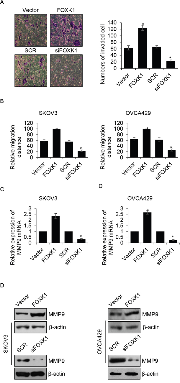 Figure 4: FOXK1 improves the migration and invasion ability of ovarian cancer cells. (A). OVCA429 cells were transfected with empty vector, FLAG-FOXK1, scramble siRNA (SCR), siFOXK1, respectively. Transwell invasion assay was used to investigate the effect of FOXK1 on cancer cell invasion. (B). FOXK1 was overexpressed or silenced in SKOV3 and OVCA429 cells, respectively. After scratch by peptide, relative migration distance was measured at different time points. (C). FOXK1 was overexpressed or silenced in SKOV3 and OVCA429 cells, respectively. The mRNA level of MMP-9 was detected by qRT-PCR. (D). FOXK1 was overexpressed or silenced in SKOV3 and OVCA429 cells, respectively. The protein level of MMP-9 was detected by western blotting.