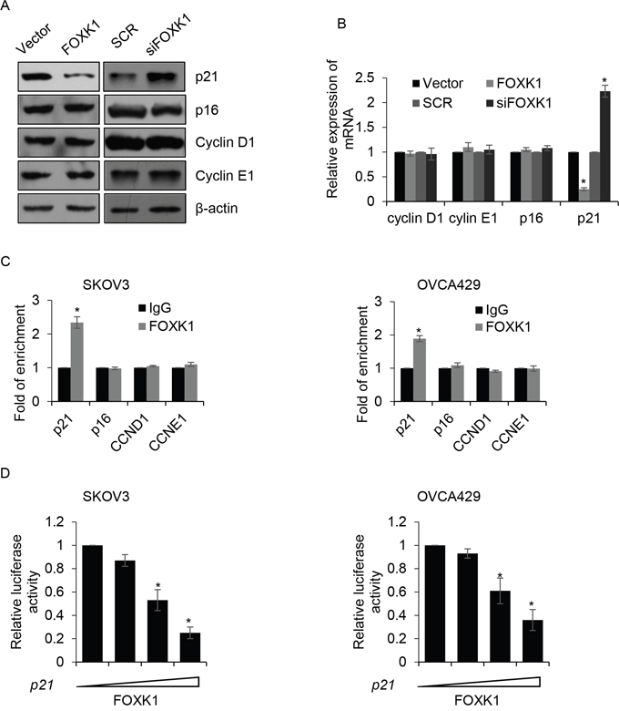 Figure 5: FOXK1 transcriptionally inhibits p21 in ovarian cancer cells. (A). SKOV3 cells were transfected with empty plasmid (vector), FLAG-FOXK1, scramble siRNA (SCR), siFOXK1, respectively. The protein levels of cyclin D1, cyclin E1, p16 and p21 were detected by western blotting. (B). FOXK1 was overexpressed or silenced in SKOV3 cells, respectively. The mRNA levels of cyclin D1, cyclin E1, p16 and p21 were detected by qRT-PCR. (C). ChIP assay was performed to detect whether FOXK1 bound the promoter region of indicated gene in SKOV3 and OVCA429 cells. (D). SKOV3 and OVCA429 cells were co-transfected with FOXK1, Renilla, pGL4-p21. 24 h after transfection, luciferase reporter assay was performed.
