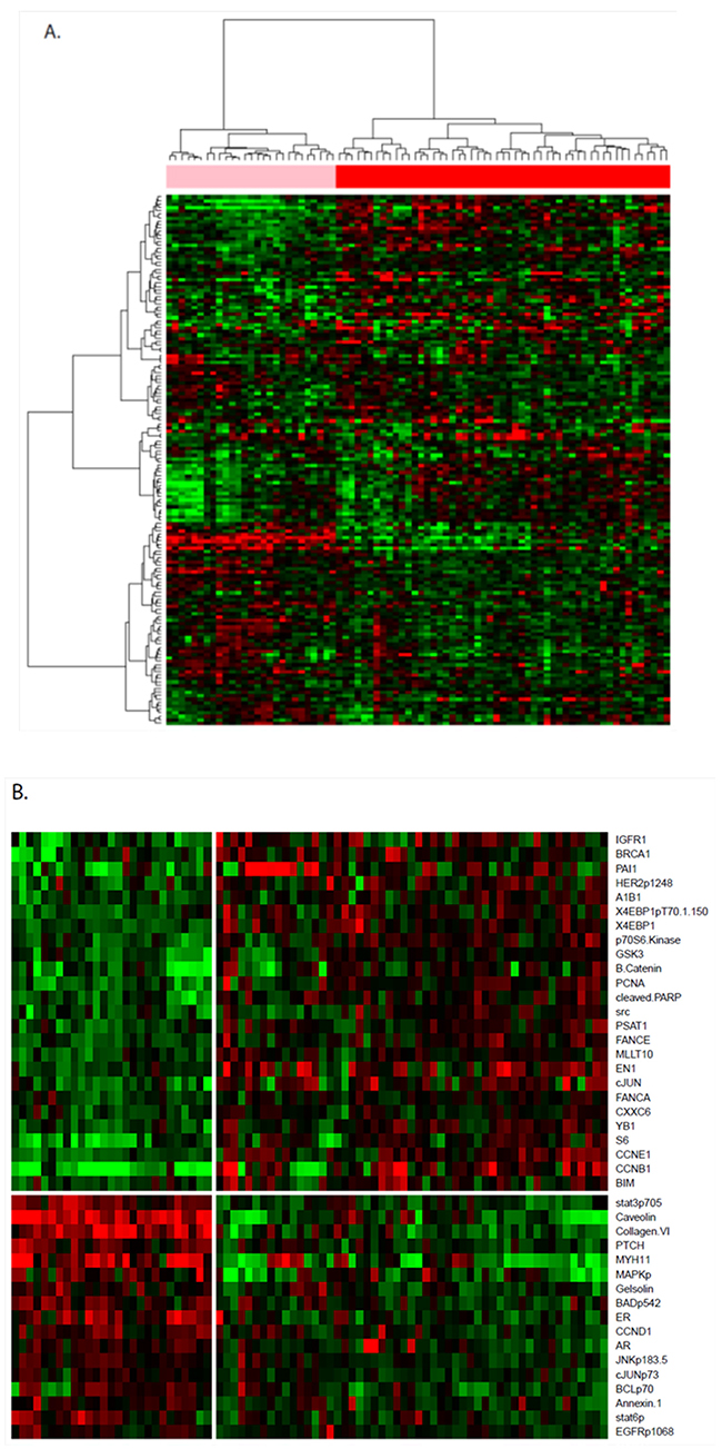 Figure 1: (A) Heatmap of unsupervised hierarchical clustering of TNBC samples with all protein expression data. Unsupervised k-means clustering separated samples into the same 2 clusters. (B) Heatmap showing the relative expression level of the 42 significantly differentially expressed proteins between the 2 stable subtypes.