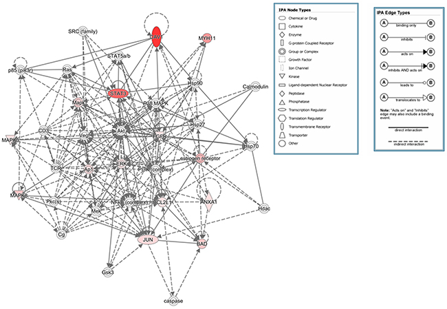 Figure 2: Top networks for the I/H-related subtype. The genes in our list are labelled in red, indicating upregulation. The depth of color reflects the degree of upregulation; the deeper the color, the more upregulated the gene is.