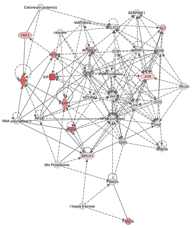 Protein signatures that were significant differentially expressed between the clusters were identified (Figure 1A, 1B and Table 1). Ingenuity pathway analysis of the protein signatures showed that the top canonical pathways associated with one of the clusters included the inflammation, hormonal receptor, and MAPK signaling pathways; we designated this cluster as the “I/H-related subtype” The canonical pathways associated with the other cluster included the Growth Arrest and DNA Damage (GADD45), DNA damage, and p53 signaling pathways; we designated this cluster as the “DD-related subtype” (Tables 1 and 2, Figures 2 and 3). The significant pathways were detected by IPA with highly significant p-values (10-6 - 10-12).