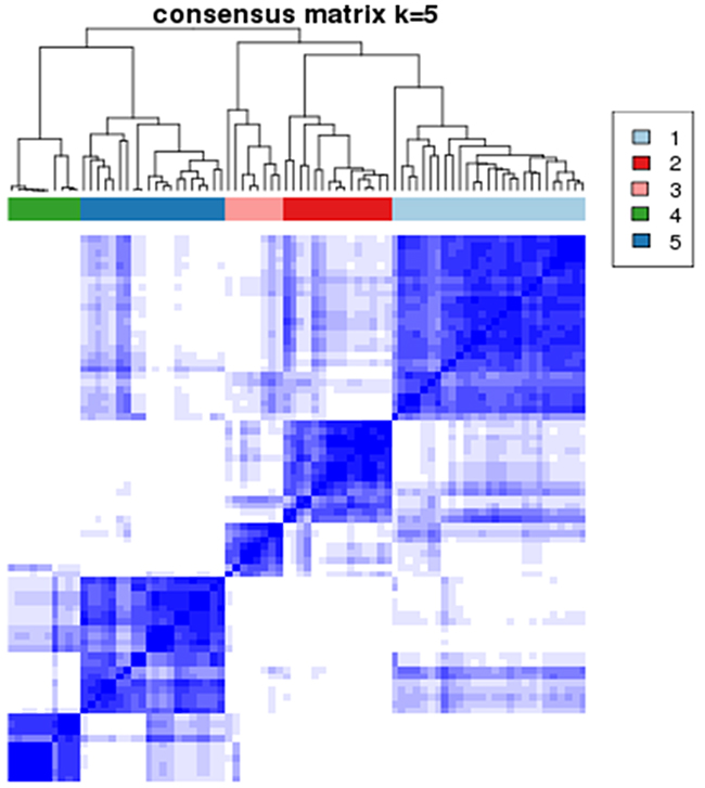 Figure 4: Consensus clustering analysis results displaying the robustness of sample classification using multiple iterations of k-means clustering. In this heatmap of the clustered consensus matrix, rows and columns of the matrix both indicate samples. The darkness of color in the heatmap represents how frequent 2 samples are clustered together. The darker, the more frequent. This heatmap clearly shows a pattern of 5 compact groups of samples frequently clustered together along the diagonal. The color bar on top indicates 5 clusters of samples.