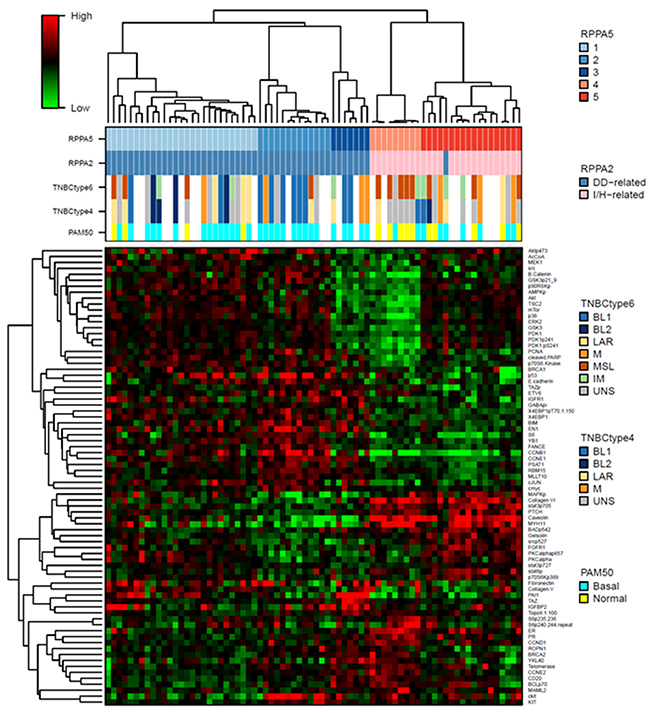 In order to investigate the biological features of our 5 RPPA clusters more accurately and determine the positive correlation with mRNA molecular subtypes, we also compared our 5 RPPA clusters with TNBCtype-4. When the RPPA clusters were compared with TNBCtype-4, there was a marginal significant association (Fisher’s exact test, p = 0.07) (Table 4B). Focused on each subtype, RPPA cluster 2 was enriched in TNBCtype-4 subtype BL1 (p = 0.006), and TNBCtype-4 subtype BL2 was enriched in RPPA cluster 1 (p = 0.043). There was no significant association between the TNBCtype-4 LAR or TNBCtype-4 M subtypes and the RPPA clusters.