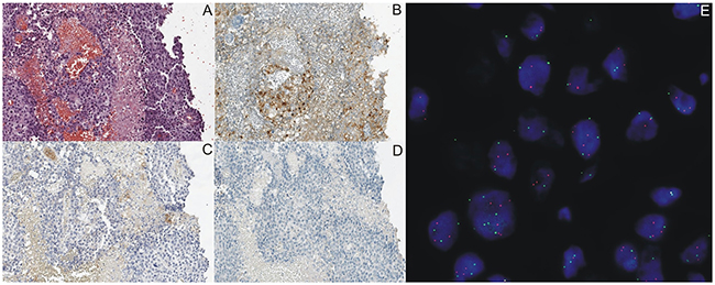Figure 4: Representative IHC staining of ALK expression using D5F3 antibody and PD-L1 expression using 22C3 and SP142 antibodies on tumor cells in the same NSCLC patients with ALK gene rearrangement detected in FISH (E) and in RT-PCR method. (A) Routine histopathological staining with hematoxylin and eosine. (B) Percentage of tumor cells with abnormal ALK protein expression was 80%. (C and D) Lack of PD-L1 expression in IHC staining using 22C3 and SP142 antibodies.