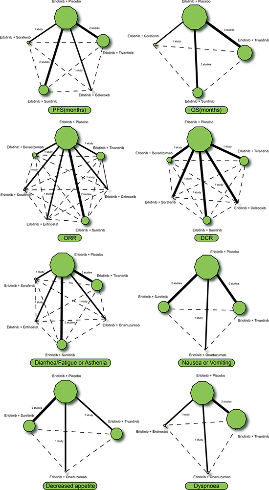 Inclusion criteria were as follows: (1) study type: randomized controlled trial; (2) treatment regimen: erlotinib + placebo, erlotinib + tivantinib, erlotinib + celecoxib, erlotinib + onartuzumab, erlotinib + sunitinib, erlotinib + entinostat, erlotinib + sorafenib and erlotinib + bevacizumab, all regimens were second-line or beyond; (3) study subject: patients with advanced/metastatic NSCLC, aged 20–90 years old, receiving radiotherapy, chemotherapy or radiochemotherapy prior to research subject recruitment; (4) outcome indicator: progression-free survival (PFS), overall survival (OS), overall response rate (ORR), disease control rate (DCR), diarrhea, fatigue or asthenia, anemia, nausea or vomiting, decreased appetite, dyspnea and neutropenia. Exclusion criteria were as follows: (1) patients with brain metastases or spinal cord compression; (2) patients without adequate blood or liver/kidney function; (3) patients with uncontrolled hypertension in the past 12 months or clinically significant cardiovascular disease; (4) non-randomized control trial; (5) letters, reviews or summaries; (6) non-English studies or non-human studies; (7) studies without complete data (e.g. not paired study); (8) duplicate studies.