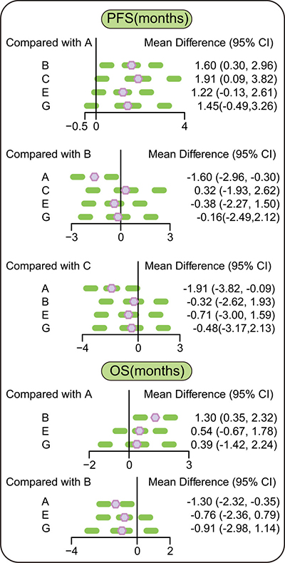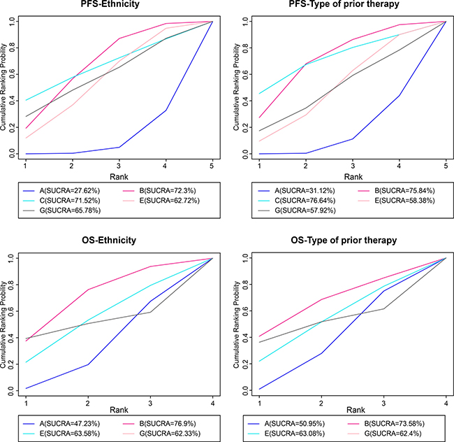 Figure 4: The cumulative sorting probability map of PFS and OS by meta regression analysis after correction. Note: PFS = progression-free survival; OS = overall survival; A = erlotinib + placebo regimen; B = erlotinib + tivantinib regimen; C = erlotinib + celecoxib regimen; E = erlotinib + sunitinib regimen; G = erlotinib + sorafenib regimen.