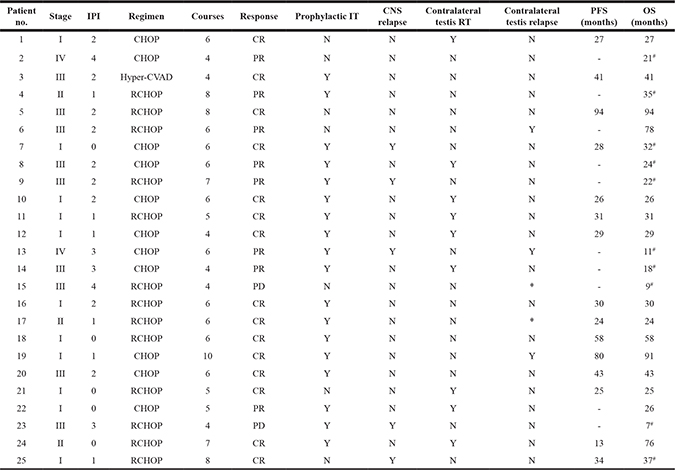 The clinical characteristics of the patients are summarized in Table 1. The median age was 60 (43–82) years. Bilateral testicular involvement was observed in two patients (8%). Eleven patients (44%) presented with stage III/IV disease. Patient 15 had spleen involvement. No other patients had involvement of extranodal sites. There were six patients (24%) who were diagnosed with the germinal center B-cell-like (GCB) and 19 (76%) with the non-GCB subtype. The mean Ki67 index was 63% (range, 30%–95%). Five patients were CD10-positive and 24 were MUM-1-positive. BCL-2 expression was observed in 18 of 25 patients.