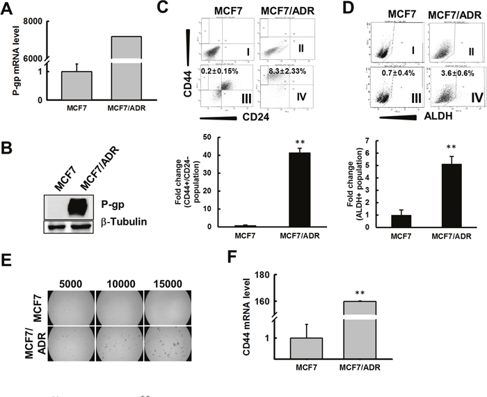 Figure 1: MCF7/ADR cells enriched for CSC characteristics. (A) Total mRNA was extracted from MCF7 and MCF7/ADR cells and qRT-PCR was performed to detect P-gp. Fold change in MCF7/ADR versus MCF7 was determined and graphed. (B) P-gp protein level determined by immunoblot analysis. β-tubulin was used as an internal control to normalize the expression of target protein. Fold change in MCF7/ADR versus MCF7 was determined by imageJ and graphed. (C) MCF7 or MCF7/ADR cells were immunostained with anti CD44/CD24 antibody and were analyzed by FACS to determine the population of CD44+/CD24- cells as a CSC marker. Total CD44+/CD24- cells are represented as fold change against MCF7 in the bar graph. Values represent the mean ± SD from 3 independent experiments. **p < 0.01 compared with MCF7. (D) MCF7 and MCF7/ADR cells were treated with ALDEFLUOR or ALDEFLOUR DEAB reagent and total population of ALDH+ cells were analyzed by FACS. Bar graph represents total population of ALDH+ cells as fold change with respect to MCF7. Values represent the mean ± SD from 3 independent experiments. **p < 0.01 compared with MCF7. (E) MCF7 or MCF7/ADR cells were seeded on ultra-low attachment plates and the number of mammospheres developed was counted after 5 days. Bar graph represents number of mammospheres formed. Values represent the mean ± SD from 3 independent experiments. **p < 0.01 compared with MCF7. (F) qRT-PCR was performed to determine expression levels of CD44 in MCF7 and MCF7/ADR cells. Values represent the mean ± SD from 3 independent experiments. **p < 0.01 compared with MCF7. (G) CD44 and β-actin levels determined by immunoblot analysis of total cell lysate from MCF7 and MCF7/ADR cells.