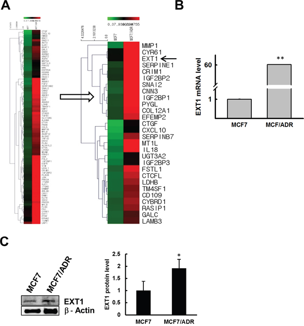 Figure 2: Doxo resistance enhances EXT1 expression in MCF7/ADR cells. Microarray data analysis revealed large number of genes up or downregulated in MCF7/ADR cells, and EXT1 was selected as a candidate gene for further study. (A) Heat map showing several genes upregulated in MCF7/ADR cells. (B) EXT1 upregulation confirmed at the mRNA level by qRT-PCR and graphed after normalization with β-actin expression. **p < 0.01 compared with MCF7. (C) EXT1 protein level was determined by immunoblot analysis. *p < 0.05 compared with MCF7.