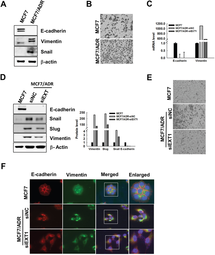 Figure 4: Knockdown of EXT1 represses EMT in MCF7/ADR cells. (A) Protein lysates of MCF7 or MCF7/ADR cells were analyzed by immunoblot analysis for EMT marker proteins, vimentin, snail, and E-cadherin. (B) 4 × 104 cells were seeded on the upper chamber of a transwell system in serum-free medium, and the lower chamber was loaded with 600 μL of complete medium, after 24 h cells migrated through the membrane were stained with hematoxylin and eosin. (C-F) Breast cancer cells, MCF7/ADR, were transfected with siEXT1 (MCF7/ADR-siEXT1) or negative control siRNA (MCF7/ADR-siNC) for 48 h. (C) mRNA level for E-cadherin and vimentin determined by qRT-PCR. (D) E-cadherin, vimentin, snail, and slug protein levels were determined in MCF7, MCF7/ADR-siNC and MCF7/ADR-siEXT1 cells by western blot analysis. Data were graphed after normalization with β-actin expression level. (E) Migratory efficacy of MCF7, MCF7/ADR-siNC, and MCF7/ADR-siEXT1 cells were determined by transwell migration assay. (F) Fluorescence immunostaining for E-cadherin and vimentin were imaged with a fluorescence microscope in MCF7, MCF7/ADR-siNC, and MCF7/ADR-siEXT1 cells.