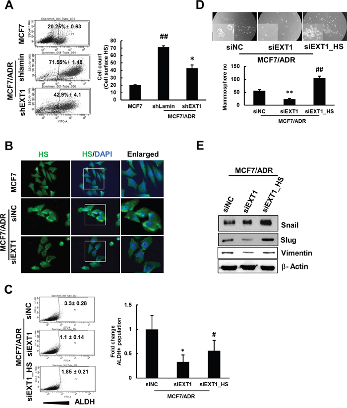 Figure 5: shRNA-mediated knockdown of EXT1 represses HS expression in MCF7/ADR cells, and HS supplement rescues MCF7/ADR cells from siEXT1 knockdown effects. Breast cancer cells, MCF7/ADR, were transfected with shEXT1 (MCF7/ADR-shEXT1) or control shLamin (MCF7/ADR-shLamin) and selected for several weeks with blasticidin (5 μg/mL). (A) Cell surface HS were determined by FACS sorting in MCF7, MCF7/ADR-shLamin, and MCF7/ADR-shEXT1 cells. Values represent the mean ± SD from 3 experiments. ##p < 0.01 compared with MCF7. *p < 0.05 compared with MCF7/ADR-shLamin. Breast cancer cells, MCF7/ADR, were transfected with siEXT1 (MCF7/ADR-siEXT1) or control siNC (MCF7/ADR-siNC) for 48 h. (B) Immunostaining for cellular HS was visualized under a fluorescence microscope in MCF7, MCF7/ADR-siNC, and MCF7/ADR-siEXT1 cells. One group of MCF7/ADR cells maintained in HS-supplemented medium and transfected with MCF7/ADR cells maintained in normal medium with siEXT1 for 48 h, forming MCF7/ADR-siEXT1_HS and MCF7/ADR-siEXT1 or control siNC (MCF7/ADR-siNC). (C) ALDH+ populations determined in MCF7/ADR-siNC, MCF7/ADR-siEXT1, and MCF7/ADR-siEXT1_HS by FACS analysis. Values represent the mean ± SD from 3 experiments.*p < 0.05 compared with MCF7/ADR-siNC. #p < 0.05 compared with MCF7/ADR-siEXT1. (D) Single cell suspension of MCF7/ADR-siNC, MCF7/ADR-siEXT1, and MCF7/ADR-siEXT_HS cells were grown on ultra-low attachment plates for 5 days and mammospheres developed were counted. Values represent the mean ± SD from 3 experiments. **p < 0.01 compared with MCF7. ##p < 0.01 compared with MCF7/ADR-siEXT1. (E) Snail, slug, and vimentin protein levels were determined in MCF7/ADR-siNC, MCF7/ADR-siEXT1, and MCF7/ADR-siEXT1_HS cells by western blot analysis.