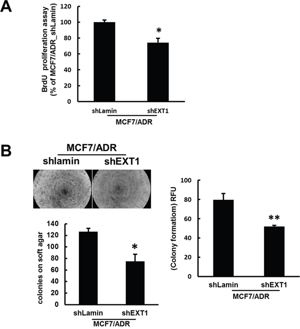Figure 6: shRNA-mediated inhibition of EXT1 represses cell proliferation and in vitro anchorage-independent growth on soft agar. (A) Proliferation of MCF7/ADR-shLamin and MCF7/ADR-shEXT1 cells determined with the BrdU proliferation assay kit. Values represent the mean ± SD from 3 experiments. *p < 0.05 compared with MCF7/ADR-shEXT1. (B) Anchorage-independent growth of MCF7/ADR-shLamin and MCF7/ADR-shEXT1 cells determined with the CytoSelect 96-well Cell Transformation Assay kit. Values represent the mean ± SD from 3 experiments. **p < 0.05 compared with MCF7/ADR-shEXT1.