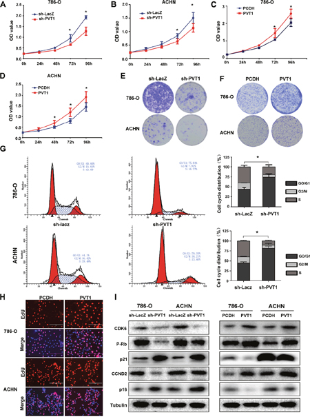 To explore the role of PVT1 in renal cancer cells, we stably regulated the expression of PVT1 in two RCC cell lines 786-O and ACHN with lenti-viral system, using short hairpin RNA (shRNA) or full-length PVT1 plasmid to silence or overexpress the PVT1 respectively. The nonspecific shRNA (LacZ) or empty plasmid (pCDH) were used as negative control, respectively. The sh-PVT1-1# was used in all the experiments for its knockdown efficiency was better than that of sh-PVT1-2#, while PVT1 overexpression was successful with considerable transfection efficiency in two cell lines (Supplementary Figure 1A, 1B). MTS assay (Figure 2A, 2B, 2C, 2D) and colony formation assay (Figure 2E, 2F) showed that knockdown of PVT1 inhibited cell proliferation in 786-O and ACHN, while PVT1 overexpression promoted cell proliferation. Flow cytometric analysis showed that PVT1 knockdown increased the number of cells in the G0/G1 phase and reduced the number of cells in the S phase (Figure 2G). EdU incorporation assay also validated PVT1 upregulation promoted cancer cell proliferation significantly in statistics (Figure 2H). To further explore the molecular changes which contributed to cell proliferation, we examined several potential proteins involved in the cell cycle progression. As shown in Figure 2I, p-Rb, CDK6 and CCND2 were downregulated, while p21 and p16 was upregulated in PVT1 downregulated cells, while PVT1 overexpression generated opposite changes. All these data demonstrated that PVT1 induced RCC cell proliferation by promoting cell cycle progression, which was in accordance to pro-proliferative functions of PVT1 by the results of GSEA of ccRCC in TCGA database (Supplementary Figure 1C).
