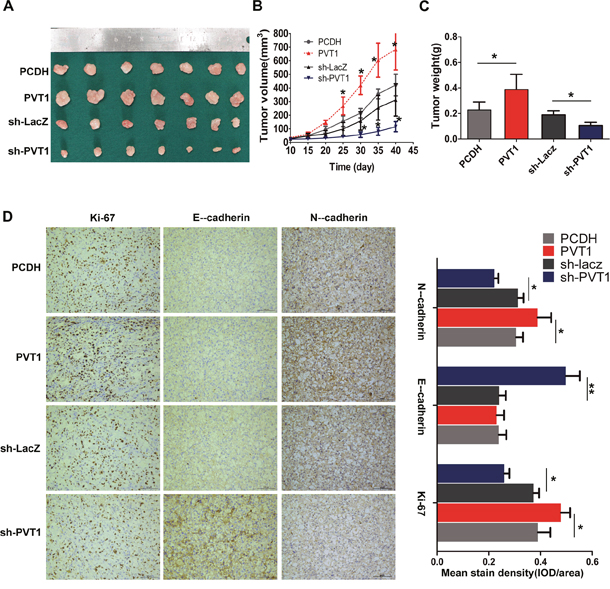 Figure 4: PVT1 promotes cell proliferation and invasion in vivo. (A) Photographs of tumors resected 40 days after inoculation of stably transfected 786-O cells into nude mice. (B) Tumor volume were measured by caliper every other 5 days. (C) Tumor weight of the four group of nude mouse at the end of 40 days. (D) Representative results of the immunohistochemical analysis for Ki-67, E-cadherin and N-cadherin in tumor sections, scale bars represent 100 mm, columns on the right are mean ± SD of mean stain density from five samples of each group. *, P<0.05; **, P<0.01.