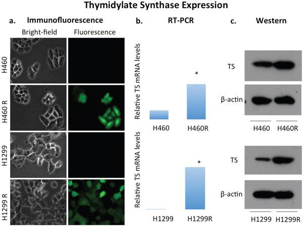 Figure 1: Overexpression of thymidylate synthase in NSCLC cell lines H460 and H1299. Pemetrexed sensitive human NSCLC cell lines H460 and H1299 expressed thymidylate synthase (TS) at low levels at baseline. Overexpression of TS in both cell lines, termed H460R and H1299R, was confirmed with (a) detection of GFP in transfected cells by immunofluorescence (TS), (b) quantification of TS mRNA by RT-PCR and (c) protein expression.