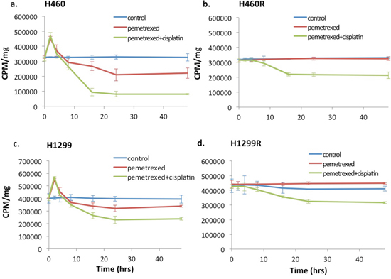 Figure 2: Pemetrexed-resistance conferred by TS overexpression results in loss of the pemetrexed-induced DNA salvage pathway “flare” in NSCLC in vitro. Pemetrexed-sensitive wild type NSCLC cell lines H460 (a) and H1299 (c) demonstrated a “flare” in thymidine salvage pathway on 3H-thymidine assay at 2 hrs. of exposure to pemetrexed. The overexpression of TS eliminated the pemetrexed-induced “flare” in thymidine salvage pathway activity in both cell lines, H460R (b) and H1299R (d). The exposure to cisplatin did not impact the presence of the pemetrexed-induced thymidine salvage pathway “flare”.