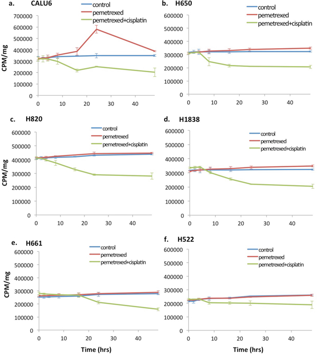 Figure 3: Wild-type resistance to pemetrexed in NSCLC cell lines results in loss of the thymidine salvage pathway induced “flare” at the 2hr time point. 3H-thymidine assay was performed on inherently pemetrexed-resistant NSCLC cell lines (a-f) following incubation without chemotherapy (culture medium only), pemetrexed (100 nM) or combination therapy with pemetrexed (100 nM) plus cisplatin (10mM). No “flare” in thymidine salvage pathway activity was seen at 2 hrs. of exposure to pemetrexed in any of the 6 pemetrexed-resistant cell lines. One cell line, CALU6 (a), demonstrated a delayed increase in thymidine pathway activity occurring at approximately 24 hrs. of therapy. Exposure to cisplatin showed no impact on the pemetrexed induced “flare”.