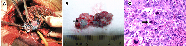 Figure 1: (A) Surgical procedure for removing PVTT. (B) More than 2/3 of The PVTT was dyed with methylene blue (Arrow). (C) Methylene blue was detected in microvessels microscopically (Arrow)