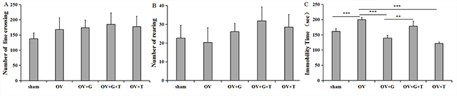 Figure 1: Ghrelin alleviate depression behavior. (A) Locomotor behavior (number of line crosses) in the open field. (B) Rearing behavior (frequency) in the open field. Group conditions are indicated by abbreviations, and doses by numbers. (C) Group conditions are indicated by abbreviations, and doses by numbers. Sham: sham treatment; OV: ovariectomy; G: Ghrelin (1 mg/kg); T: tamoxifen (15 mg/kg). Values are mean ± S.E.M, n = 5–8, Symbols represent significant post hoc comparisons: Tukey’s HSD, **P < 0.01 and ***P < 0.001.