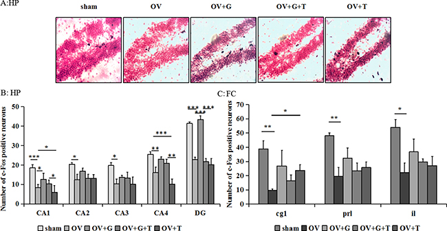 Figure 2: Ghrelin increases the c-Fos-positive cells in hippocampus. (A) Representative sections through the dentate gyrus (inset: greater magnification near the tip of the dentate), showing c-Fos stained cells (dense brown nuclear staining) and counterstaining with neutral red. (B) The number of c-Fos positive cells in the dentate gyrus of the hippocampus. (C) The number of c-Fos positive cells in the subregions of the frontal cortex: Cg1, IL, and PrL. Group conditions are indicated by the following letters and abbreviations. HP: hippocampus; FC: frontal cortex; Sham: sham treatment; OV: ovariectomy; G: Ghrelin (1 mg/kg); T: tamoxifen (15 mg/kg). Values are mean ± S.E.M, n = 3–11, Symbols represent significant post hoc comparisons: Tukey’s HSD, *P < 0.05, **P < 0.01 and ***P < 0.001.