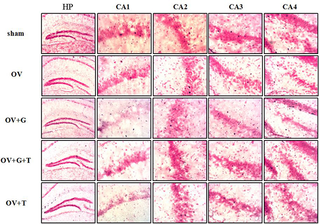 Figure 4: Ghrelin increased BrdU expression in the dendate gyrus of the hippocampus. The arrows show BrdU stained cells. Group conditions are indicated by the following letters and abbreviations: sham (sham treatment), OV (ovariectomy), G (Ghrelin, 1 mg/kg) and T (tamoxifen, 15 mg/kg).