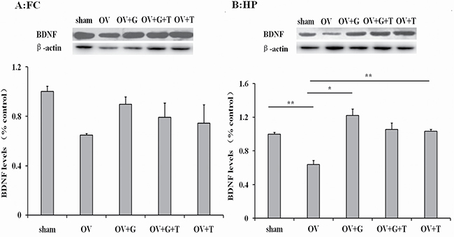 Figure 6: Ghrelin possible involve BDNF signaling pathway. Figures represent the BDNF levels (normalized to β-actin) in the frontal cortex (A) and hippocampus (B). Group conditions are indicated by abbreviations and doses by numbers. HP: hippocampus; FC: frontal cortex; Sham: sham treatment; OV: ovariectomy; G: ghrelin (1 mg/kg); T: tamoxifen (15 mg/kg). Values are mean ± S.E.M, n = 4, Symbols represent significant post hoc comparisons: Tukey’s HSD, *P < 0.05 and **P < 0.01.