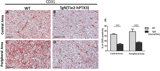 Figure 3: Immunohistochemical (A-D) and morphometric analysis (E) of CD31 immunoreactivity in central (A-B) and peripheral (C-D) areas of TRAMP-C2 grafts harvested from wild type (WT) (A-C) and TgN(Tie2-hPTX3) (C-D) mice. The percentage of CD31-positive endothelial cells (E) decreases significantly in both central (B) and peripheral (D) areas of TgN(Tie2-hPTX3) samples as compared to WT samples (***p< 0.001). Scale bars: A-D, 60 μm. Data are reported as means ± SEM. Bonferroni post-test was used to compare all treatment groups after one-way ANOVA.