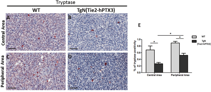 Figure 4: Immunohistochemical (A-D) and morphometric analysis (E) of tryptase immunoreactivity in central (A-B) and peripheral (C-D) areas of TRAMP-C2 grafts harvested from wild type (WT) (A-C) and TgN(Tie2-hPTX3) (C-D) mice. The percentage of tryptase-positive mast cells (E) decreases significantly in both central (B) and peripheral (D) areas of TgN(Tie2-hPTX3) samples as compared to WT samples (*p< 0.05). Scale bars: A-D, 60 μm. Data are reported as means ± SEM. Bonferroni post-test was used to compare all treatment groups after one-way ANOVA.