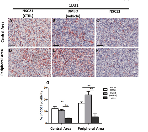 Figure 5: Immunohistochemical (A-F) and morphometric analysis (G) of CD31 immunoreactivity in central (A-C) and peripheral (D-F) areas of TRAMP-C2 grafts harvested from wild-type mice treated i.p. with NSC21 (A-D), DMSO (B, E) or NSC12 (C-F). The percentage of CD31-positive endothelial cells (G) decreases significantly in both central (C) and peripheral (F) areas of NSC12-treated tumors as compared to DMSO- or NSC21-treated lesions (**p< 0.01) (A, B, D, E). Scale bars: A-D, 60 μm. Data are reported as means ± SEM. Bonferroni post-test was used to compare all treatment groups after one-way ANOVA.