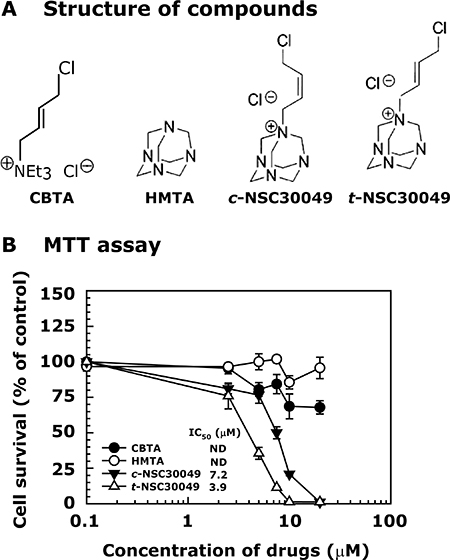 We synthesized cis-NSC30049 (c-NSC30049) and trans-NSC30049 (t-NSC30049) in our laboratory [16]. We tested their biological activity in a cell survival experiment (MTT-assay) against HCT-116 cells. First, to understand whether the halogen group (Cl−), a suspected DNA-reactive group, and the ring structure of the NSC30049 indecently carry the growth inhibitory activity, we used (4-Chloro-but-2-enyl)triethylammonium chloride (CBTA) and hexamethylenetetramine (HMTA), for the synthesis of NSC30049 (Figure 1A) [16]. Results show that CBTA and HMTA have very little cytotoxic effect, suggesting that the halogen group of CBTA and the ring structure of the HMTA alone may not be sufficient for the cytotoxic effect of NSC30049. Second, we determined the stereoisomeric effect of NSC30049 on the survival of HCT-116 cells. We found that t-NSC30049 was more active than c-NSC30049 (IC50 3.9 and 7.2 μM, respectively) (Figure 1B). Since t-NSC30049 – from here onward called as NSC49L (where L denotes for the lead compound) – has better potency than c-NSC4009, we used NSC49L in our further studies.