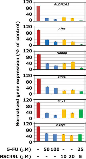 Figure 3: Effect of NSC49L and 5-FU either alone or in combination on the mRNA levels of key marker and self-renewal genes. For these experiments, CA2 cells were treated with different concentrations of NSC49L and 5-FU either alone or in combination for 72 h. Total RNA was isolated and the expression levels of different genes was determined by qRT-PCR. The expression was normalized with GAPDH mRNA levels. Data are mean ± SE of three different estimations.