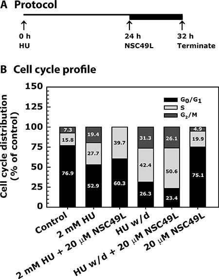 Figure 4: Cell cycle profile of HT29 cell line-treated with NSC49L and HU either alone or in combination. Panel (A) describes the assay protocol. Panel (B) shows the data as a stacked bar graph. Cells were grown in 0.5% FBS for 20 h and then treated with 2 mM HU for 24 h. Then, either in the presence or absence of HU, cells were treated with 20 μM NSC49L for an additional 8 h. After treatment, cells were processed for cell cycle analysis by fluorescence-activated cell sorting (FACS). The ranges for G0/G1, S and G2/M-phase arrested cells were established on the basis of the corresponding DNA content of the histograms. At least 10,000 cells per sample were considered in the gated regions for calculations. Data are mean percent distribution of DNA content of two different experiments.