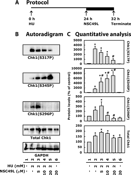 Figure 5: Treatment of NSC49L and HU differentially regulate total and phosphorylated levels of Chk1 in HT29 cells. Panel (A) depicts the protocol of the assay. Cells were treated with 2 mM of HU for 24 h followed by different concentrations of NSC49L for 8 h. Panel (B) shows representative autoradiograms of Chk1 Western blots analyzed with whole cell extract. Normalization of protein loading was assessed by GAPDH. Panel (C) is the quantitative analysis of autoradiograms. Data are mean ± SE of three different experiments.