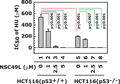 Figure 7: Synthetic lethal effect of NSC49L and HU treatment to HCT116(p53−/−) cells. The isogenic HCT116(p53+/+) and HCT116(p53−/−) cell lines were treated with different concentrations of NSC49L and HU for 72 h in 96-well plates. The IC50 of HU was determined by MTT assay. Data are mean ± SE of three different experiments. The p value is given and compared with its comparative groups.