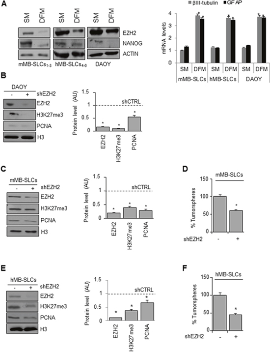Figure 1: Genetic EZH2 knockdown impairs MB cell proliferation and self-renewal. (A) Left: representative Western Blot for EZH2 and NANOG protein levels in mMB-SLCs, hMB-SLCs and DAOY cells grown in SM and DFM. ACTIN was used as loading control. Right: mRNA levels of βIII-tubulin and GFAP of all the three models in SM and DFM. *p<0.05. (B-C-E) Left: representative Western Blot showing protein levels of EZH2, H3K27me3 and PCNA before and after shEZH2 in DAOY cells (B), mMB-SLCs (C) and hMB-SLCs (E). Dashed bars represent shRNA-non-target control (shCTRL). H3: loading control. Right: densitometric analysis of protein levels from three independent experiments. *p<0.05. (D-F) Self-renewal ability (percentage of tumorspheres) of mMB-SLCs and hMB-SLCs after shEZH2 or shCTRL. *p<0.05.
