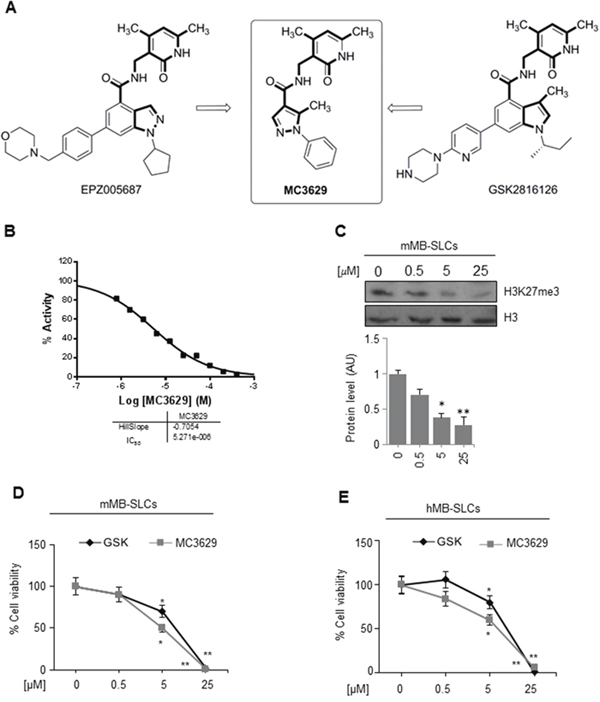 Figure 2: The EZH2 inhibitor MC3629 impairs SHH MB-SLCs viability. (A) Design of MC3629 starting from modification of the EPZ005687 and GSK2816126 structures. (B) EZH2/PRC2 assay in 10-dose IC50 mode with 2-fold serial dilution starting from 400 μM solution. Histone H3/H4 tetramer was used as the substrate. (C) Representative Western Blot (up) and densitometric analysis (down) of H3K27me3 protein levels in mMB SLCs treated for 48 h with 0.5, 5 and 25 μM of MC3629. *p<0.05, **p<0.01. (D-E) Evaluation of cell viability, measured with MTS assay, of mMB-SLCs (D) and hMB-SLCs (E) treated with increasing concentrations of MC3629 and GSK2816126 at 48 h. p value versus untreated cells: *p<0.05, **p<0.01.