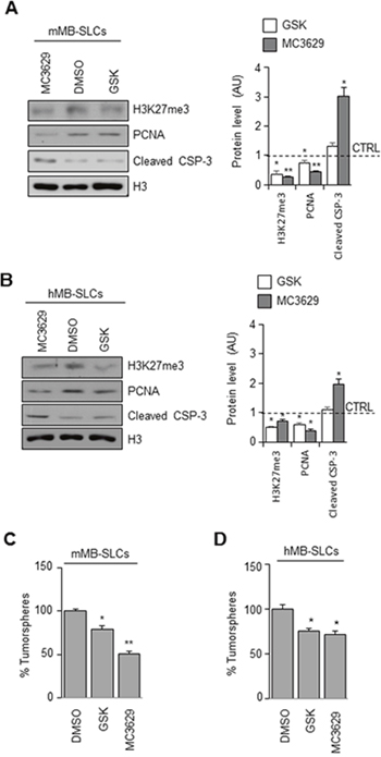 We analyzed the biological effects of MC3629 treatment in mMB-SLCs and hMB-SLCs using GSK2816126 as a reference drug. As shown in Figure 3A and 3B, both EZH2i significantly impaired H3K27me3 and PCNA protein levels, and MC3629 induced apoptosis, detected as increased level of cleaved caspase 3. Furthermore, we investigated whether the two compounds were able to impair stemness, both MC3629 and GSK2816126 significantly reduced mMB-SLC and hMB-SLC self-renewal (Figure 3C and 3D).