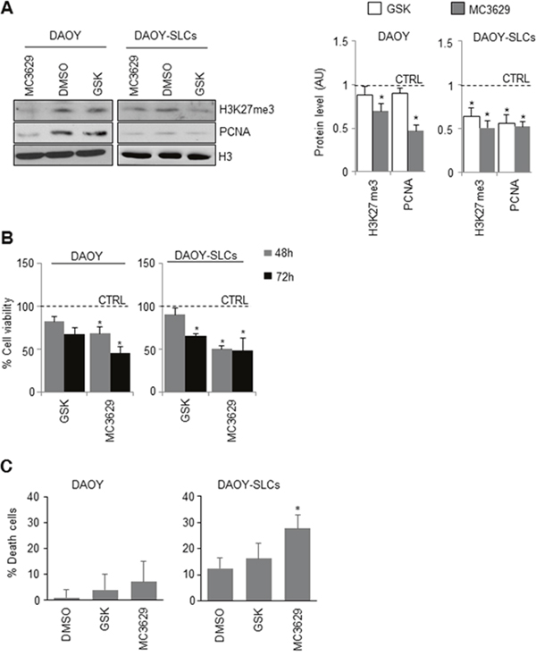 We then tested the effects of MC3629 and GSK2816126 in DAOY and DAOY-SLCs. In DAOY cells, H3K27me3 and PCNA levels resulted impaired only by MC3629 (Figure 4A). In DAOY-SLCs, H3K27me3 and PCNA levels were down modulated by both drugs (Figure 4A). Such effects were confirmed in DAOY cells and DAOY-SLCs: MC3629 impaired cell viability in both cell systems after 48 h, while GSK2816126 was able to significantly impair DAOY-SLCs viability after 72 h of treatment (Figure 4B). Moreover, MC3629 induced cell death in DAOY-SLCs (Figure 4C).