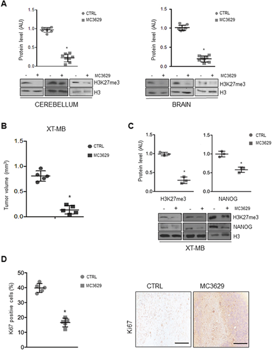 Figure 5: Biological effects of MC3629 in vivo. (A) Representative Western Blots show H3K27me3 levels in cerebellum and brain from wild type mice treated with MC3629 or vehicle (CTRL). Dot plots represent densitometric analysis of all samples. *p<0.05. (B-D) Xenograft tumors (XT-MB) were generated in mice, after 10 days MC3629 was administered twice a week for 3 weeks; control mice were treated with vehicle (CTRL). (B) Xenograft volume (mm3) evaluated at the maximum diameter; dot plot represents mean±S.D. *p<0.05. (C) Representative images of Western Blot and densitometric analysis of H3K27me3 and NANOG. H3: loading control *p<0.05. (D) Xenograft sections were immunostained for the proliferation marker Ki67: on the left, dot plot shows Ki67 levels of proliferating cells; on the right, representative images of the staining. *p<0.05.