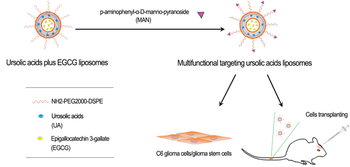 Accordingly, to develop a drug delivery system that could induce the apoptosis of glioma stem cells is worth studying. Liposomes, hollow spheres that made up by phospholipid bilayer, are able to meanwhile load both hydrophilic and hydrophobic drugs. They could decrease the toxicity and increase the bioavailability of drugs [5, 6]. In present research, we built functional liposomes that could pass through the blood-brain barrier (BBB). Ursolic acids (UA) and epigallocatechin 3-gallate (EGCG) were loaded into liposomes as anti-cancer drugs that could induce the apoptosis of glioma cells and glioma stem cells at the same time. P-amino-phenyl-α-D-manno-pyranoside (MAN) shows good effects on assisting drug’s carrier to be penetrated across the BBB [7]. It is reported that MAN has a specific affinity to glucose transporters 1 (GLUT1), which is highly expressed on BBB and brain gliomas [8]. Depending on this advantage, the amount of drugs in the brain could be increased after being penetrated across the BBB. So we modified MAN onto the surface of the liposomes as a targeting ligand in order to play a key role in transporting across the BBB as well as enhance the targeting ability of drug-loaded liposomes.