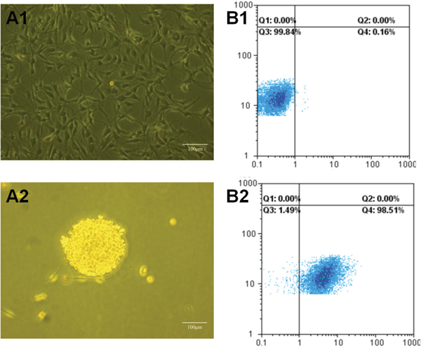 Figure 3: Images of C6 glioma cells and C6 glioma stem cells under microscope and FAScan flow cytometry. (A1) Images of C6 glioma cells under microscope; (A2) images of glioma stem cells(GSCs) under microscope; (B1) glioma stem cells spheroids treated as isotype controls under FAScan flow cytometry; (B2) glioma stem cells spheroids stained with anti-mouse/rat nestin phycoerythrin antibiodies under FAScan flow cytometry.