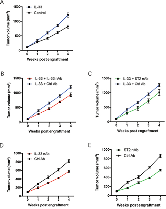 Figure 2: IL-33 blockade restricts tumor growth of NSCLC xenografts. (A) NSCLC xenografts were treated with recombinant human IL-33 protein or the control and detected for tumor growth at the indicated time. (B, C) NSCLC xenografts were treated with recombinant human IL-33 protein plus IL-33 neutralizing antibody (B) or ST2 neutralizing antibody (C). (D, E) NSCLC xenografts were treated with IL-33 neutralizing antibody (D) or ST2 neutralizing antibody (E) and analyzed for tumor growth. Shown are mean±SEM from 6 independent experiments.