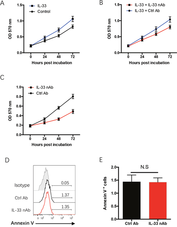To understand the mechanisms underlying limited NSCLC growth by IL-33 blockade, freshly isolated NSCLC cells from surgical tissues were incubated with recombinant human IL-33 protein with or without IL-33 neutralizing antibody and analyzed for their proliferative survival by MTT assay. IL-33 promoted outgrowth capacity of human NSCLC cells, which could be blocked by IL-33 neutralization (Figure 3A, 3B). Further, IL-33 neutralization itself exerted an inhibitory function in NSCLC proliferative survival (Figure 3C), suggesting that IL-33 promotes NSCLC outgrowth through an autocrine manner. These data were in line with our previous study that showed a robust expression of IL-33 and ST2 in tumor cells of NSCLC patients [20]. In contrast, we did not observe a significant effect of IL-33 blockade on NSCLC apoptosis (Figure 3D, 3E). Collectively, IL-33 blockade suppresses NSCLC progression, at least partly, through a direct inhibition on NSCLC outgrowth.